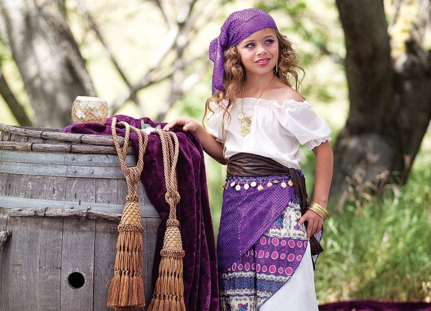 Это могут быть старые бабушкины платки. С дополнительными аксессуарами получится образ юной цыганки.