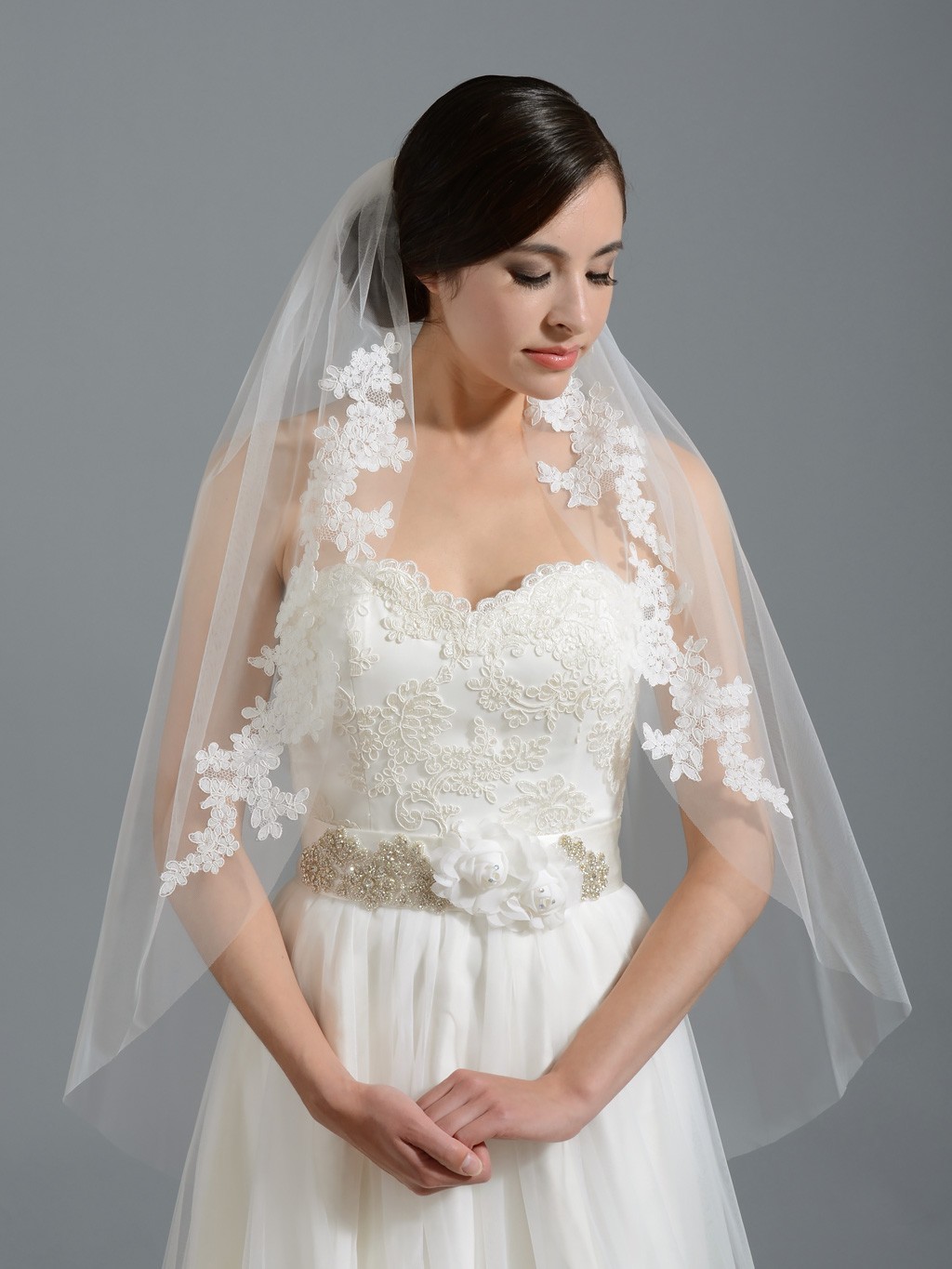 Кружевная отделка или фата-мантилья целиком из кружева смотрится наиболее эффектно. Кружево может быть только спереди, обрамляя лицо мягкими воздушными складками, или нашивается по всему периметру легкой ткани, заставляя ее ниспадать волнообразными складками. Под такую фату не стоит делать высокую прическу – она более тяжелая, и волосы быстро утратят первоначальный объем. Испанская мантилья может накидываться на голову, как закрывая лицо, так и ниспадая по бокам, или же закрепляться сзади, на собранных в пучок волосах, ниспадая до пола эффектными складками.