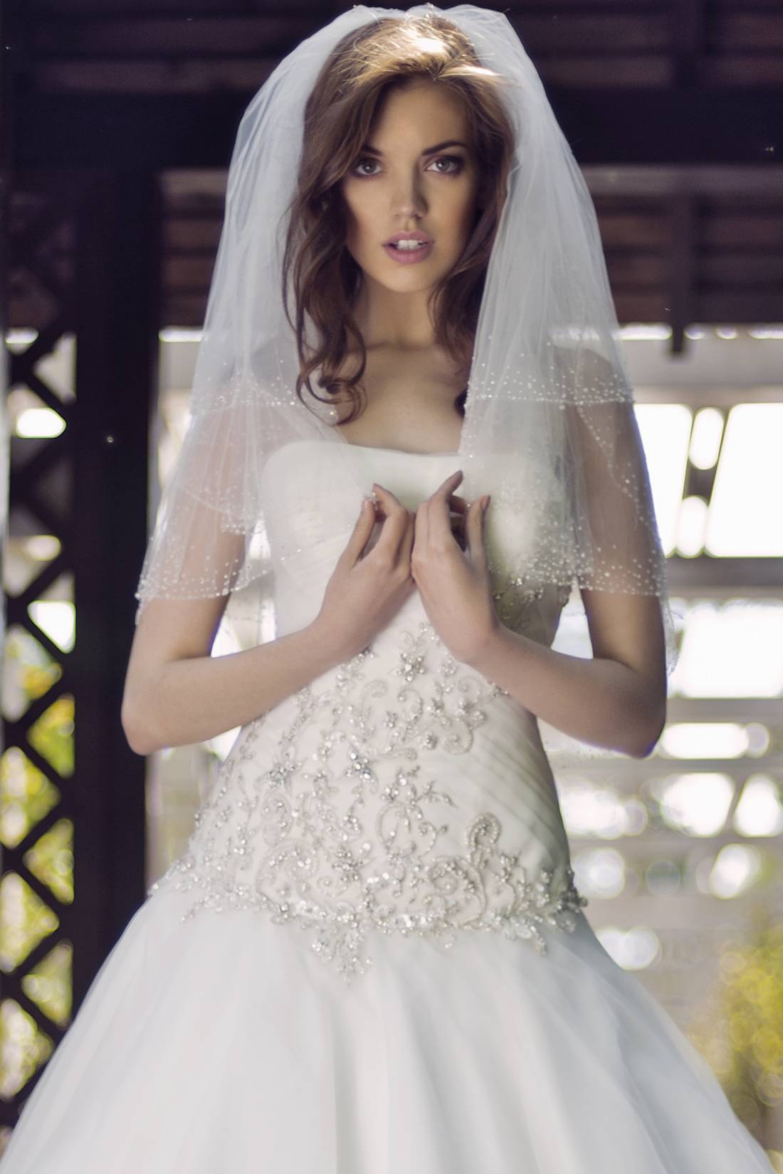 Квадратное лицо, массивная нижняя челюсть. Чтобы сгладить лицо, можно приобрести двуслойную фату с округлым краем, невесомая и длинная фата, которая чуть обрамляет лицо, также подойдет.