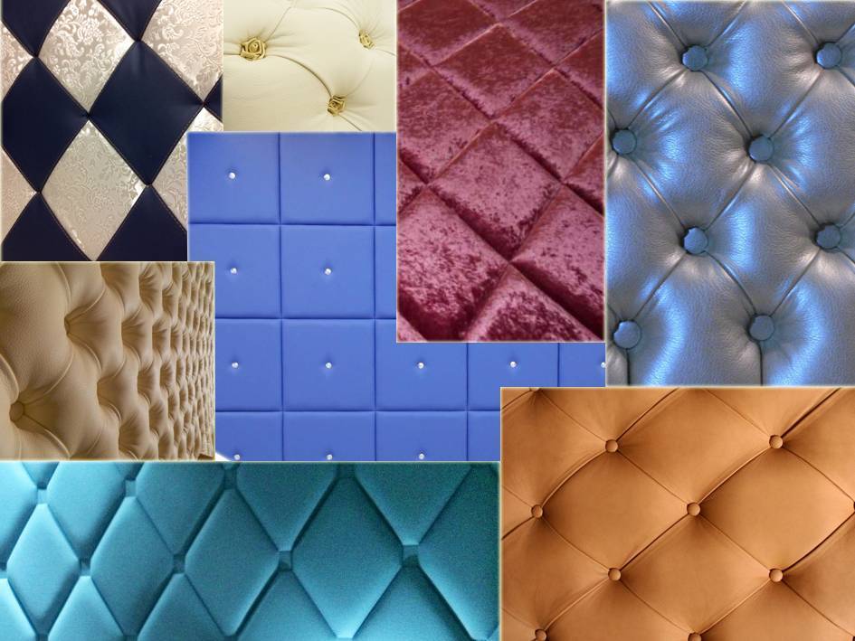 Маленькие мягкие панели, похожие на плиты и ромбики на стену, своими руками сделать еще проще и быстрее. Подготавливается нужного размера лист фанеры, синтепон и драпировочный материал. Ткань при помощи степлера фиксируют с одной стороны к фанере. С лицевой стороны приклеивается поролон. После этого ткань натягивается равномерно по всей площади и фиксируется с оставшихся сторон степлером.
