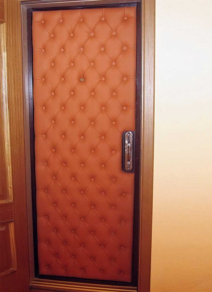 Самый популярный способ обшивки двери — при помощи искусственной кожи. Такая отдела позволяет одновременно с улучшением внешнего вида повысить показатели тепло- и звуко- изоляции. Но есть у этого типа обивки дверей и минусы — это самый сложный технологический процесс, требующий хотя-бы общих представлений о порядке действия.