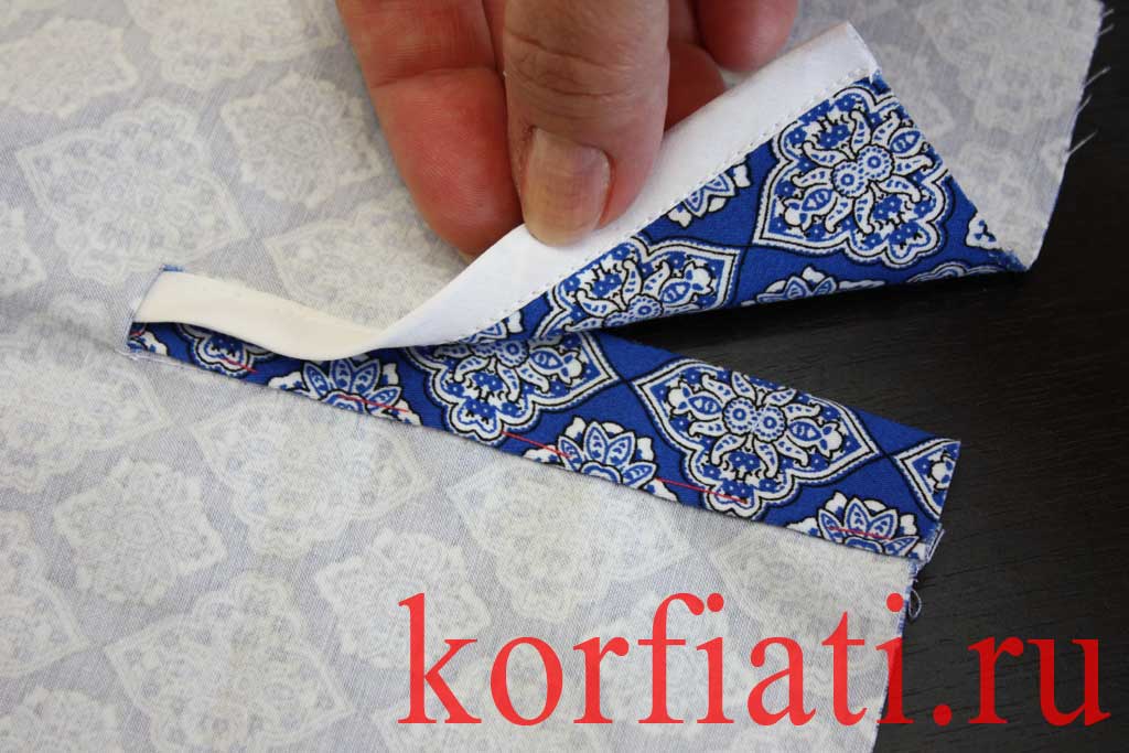 Самый распространённый способ обработки такого разреза — это обработка косой бейкой. Чаще всего ее применяют на женских романтических блузах и платьях, а также на детских изделиях.