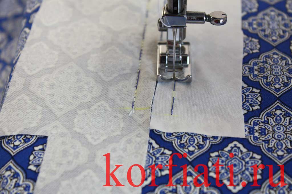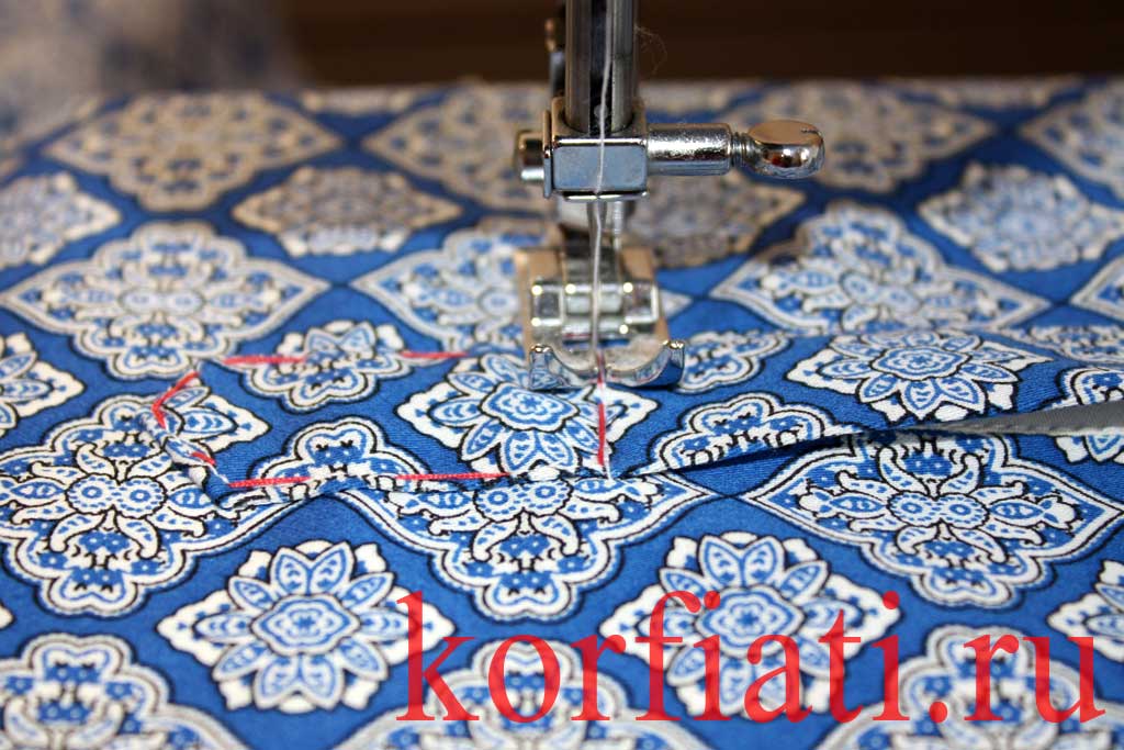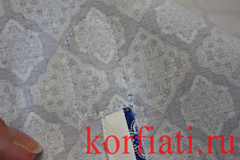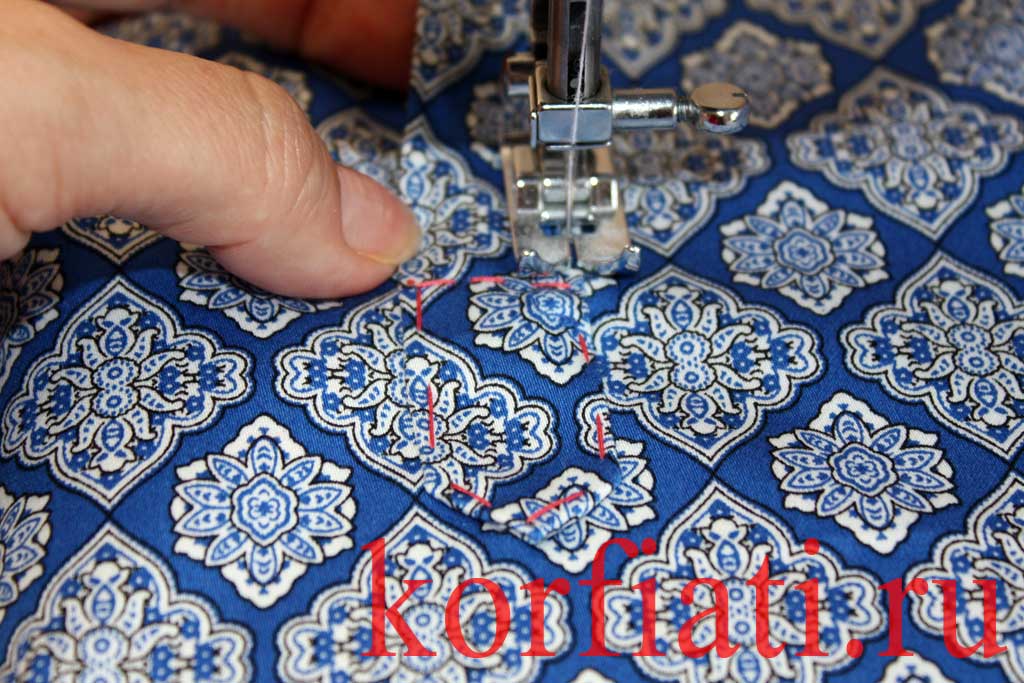 Далее вымётываем верхнюю широкую часть планки, выкладывая сверху ровный уголок. Делаем отстрочка также в пикюр (то есть на 1 мм от края) по контуру «домика» и далее поперек планки над тем местом, где закончился разрез. Иногда этот участок отстрачивают крест на крест.