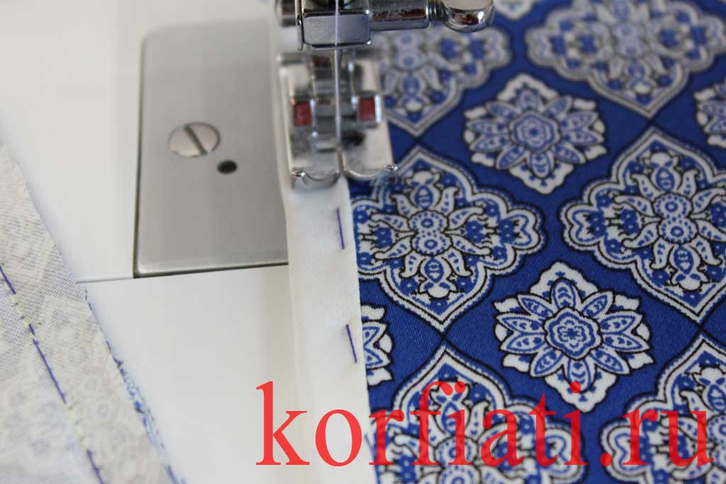 Прежде чем приступать, к шитью необходимо на планке заутюжить и заметать припуски. Воспользуйтесь для заутюжки шаблоном без припусков. Красным маркером на шаблоне размечена линия разреза, тразмечаем ее на ткани. Синей линией отмечена линия, по которой будем прокладывать строчку.