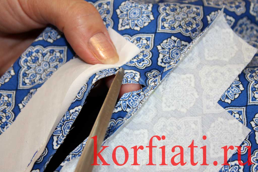 В изделиях из толстых материалов высекают излишки припусков боковых и рельефных швов на участке припуска подгиба низа.