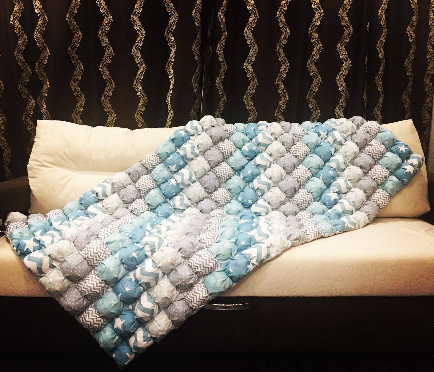 Одеяло бонбон (или бомбон) — это легкое воздушное изделие с плоской изнаночной стороной и объемной лицевой, которая составлена из одинаковых по размеру квадратиков. Можно сказать, что лицевая поверхность напоминает множество маленьких пуфиков, нашитых на плотную основу.