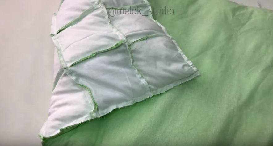 - У вас должны получиться «кармашки» со складочками. Набейте кармашки наполнителем. По нижнему краю заложите складки на каждой «подушечке», а затем прострочите, закрывая ряд.