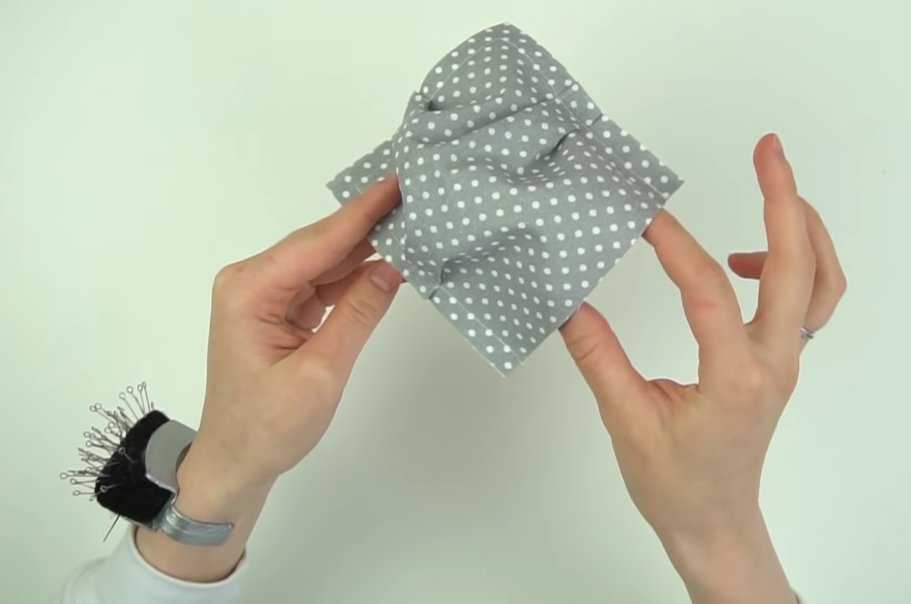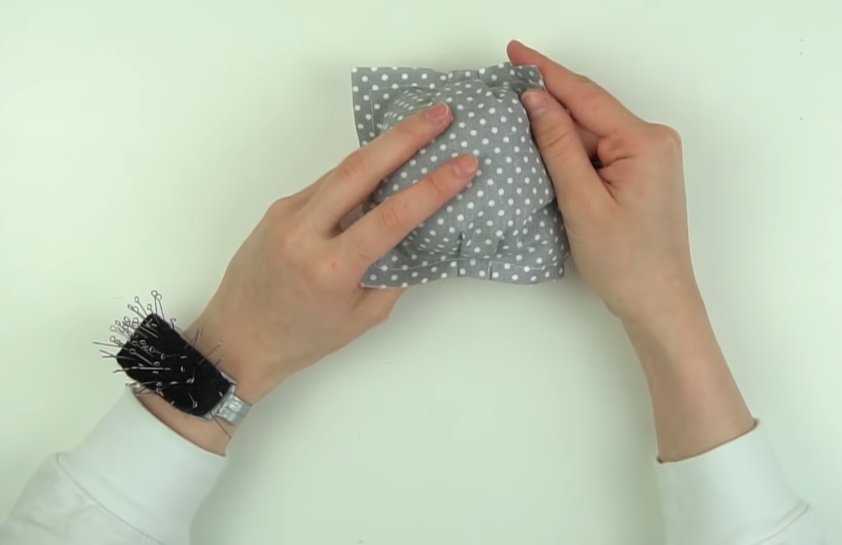 - Далее выкраиваются квадраты – один большой (из основной ткани), другой поменьше (из подкладочной). Они скалываются друг с другом булавками, с закладыванием складок на всех сторонах большого квадрата, чтобы он стал по размеру равен маленькому. Это даст возможность набить подушечки наполнителем.