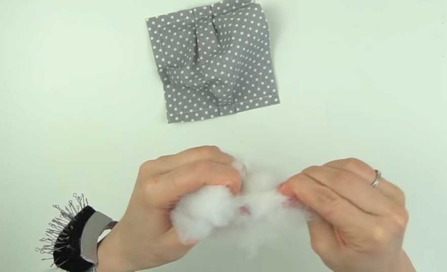 - У вас должны получиться «кармашки» со складочками. Набейте кармашки наполнителем. По нижнему краю заложите складки на каждой «подушечке», а затем прострочите, закрывая ряд.