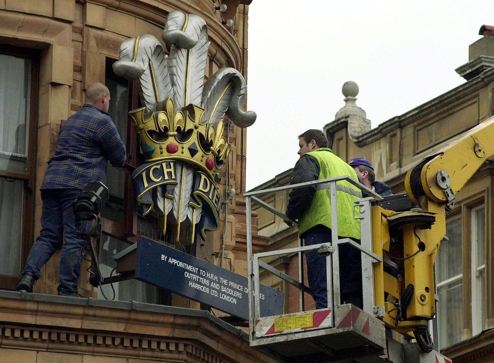Рабочие в декабре 2000 года снимают ордер Чарльза, принца Уэльского с фасада Harrods. Фото Matthew Fearn — PA Images/Getty Images
