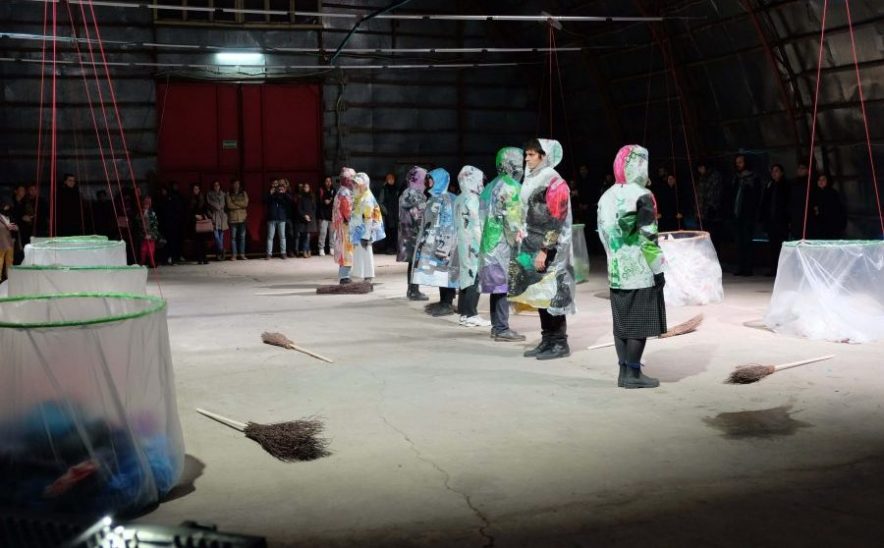 Я хотела показать проблематику индустриального мира и переизбытка пластмассы через театрализованное представление — модели с метлами в руках сгребали из центра ангара полиэтиленовый мусор, сортируя его по цвету.