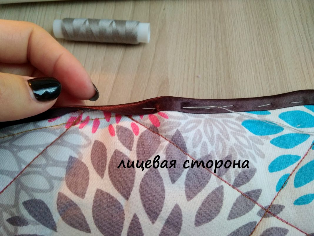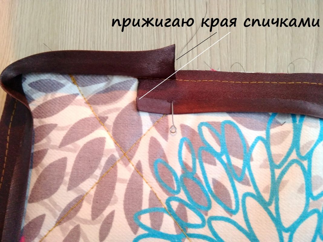 11. Перегибаю косую бейку на лицевую сторону. Пришиваю свободный край бейки к основе органайзера ручными сметочными стежками.