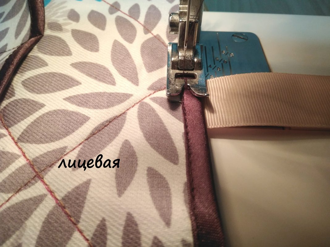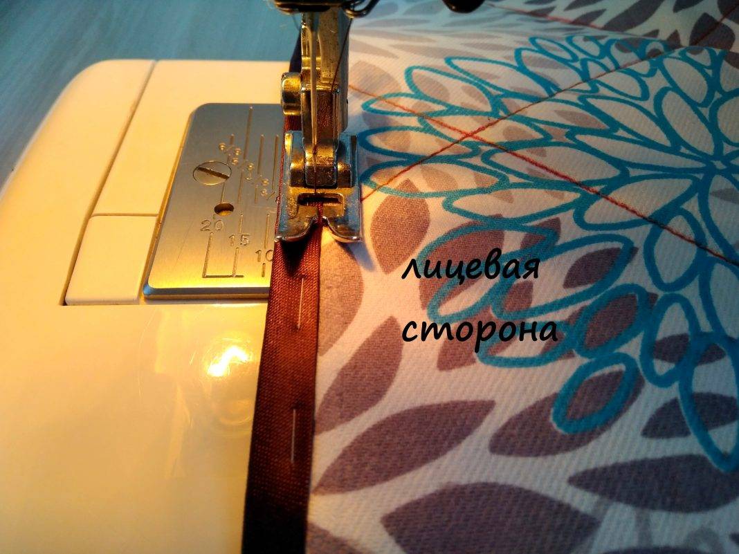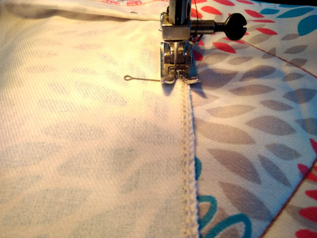 Обратите внимание, как я положила ткань по отношению к лапке машинки. Строчка должна проходить на 1 мм