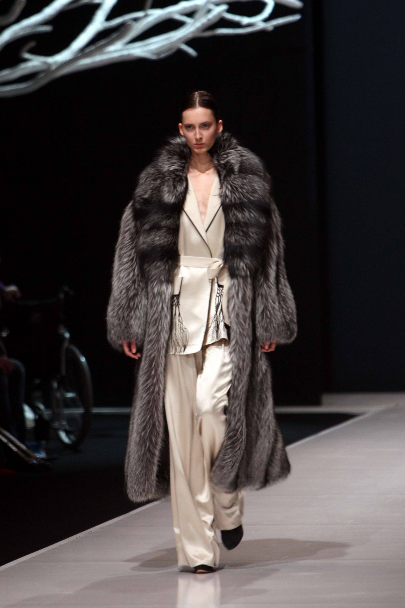 Юдашкин вдохновился рок-музыкой. В его зимних костюмах для женщин Вы увидите: глубину оттенков и ритм. Каждая модель выглядит в виде хордовой композиции.