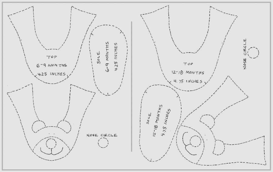 Выкройка тапочек с медвежатами. Выкройку подошвы можно нарисовать обведя стопу малыша карандашом на бумаге. Обводить нужно в положении стоя и оставлять немного места на вырост, чтобы обувь не слишком плотно прилегала к ножке.