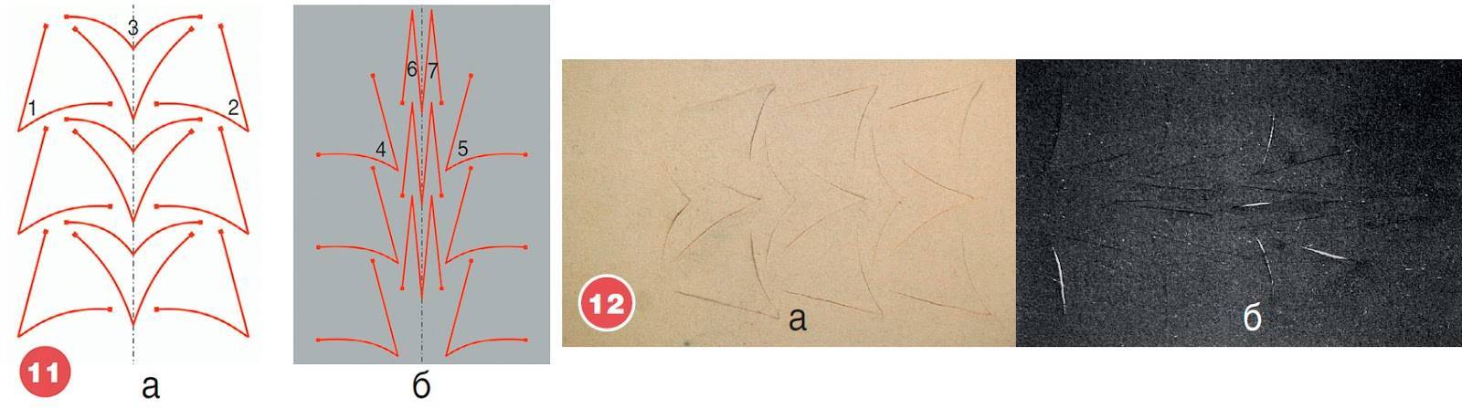 Сначала эскиз прорезей наносится на лекало детали изделия верхнего слоя, затем выполняются прорези по намеченным линиям. Затем лекало детали (шаблон) с прорезями накладывается на нижний слой и отмечаются места, где можно будет отогнуть отлетные части нижнего слоя. После этого создается рисунок на нижнем слое и выполняются прорези по линиям. Далее слои накладываются друг на друга и определяется, какие детали будут отгибаться и переплетаться между собой, одновременно продумываются места их закрепления. По одним и тем же прорезям можно сделать несколько вариантов закрепления и переплетения слоев, и каждый раз будет получаться разный рисунок. На илл. 11 показаны эскизы для прорезей верхнего (11 а) и нижнего (11 б) слоев материала. Можно использовать одинаковый рисунок прорезей для обоих слоев и при их соединении переплести отлетные детали между собой.