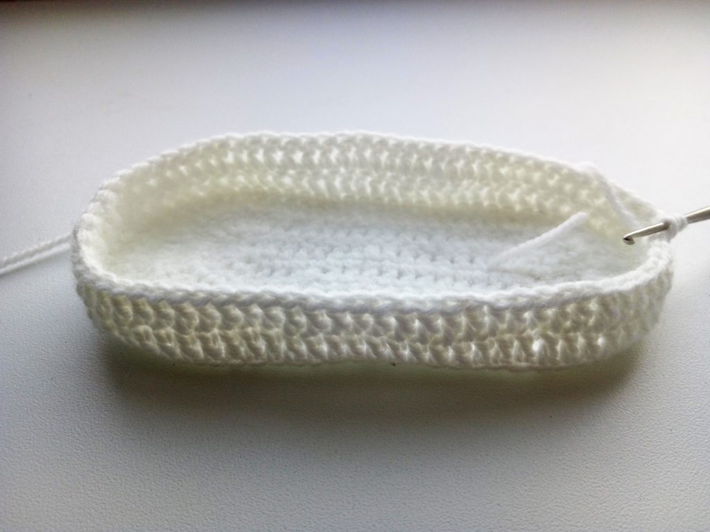 Затем вяжу ряд с.с.н. за заднюю стенку и ряд с.с.н. как обычно, формируя бортик пинетки.
