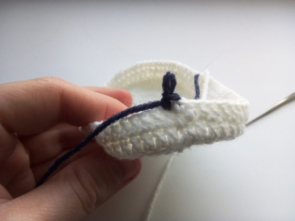 Белую нить отрезаем. Прячем кончики ниток.С башмачком мы закончили. Переходим к голенищу и язычку и дальнейшему оформлению пинеток-ботинок.