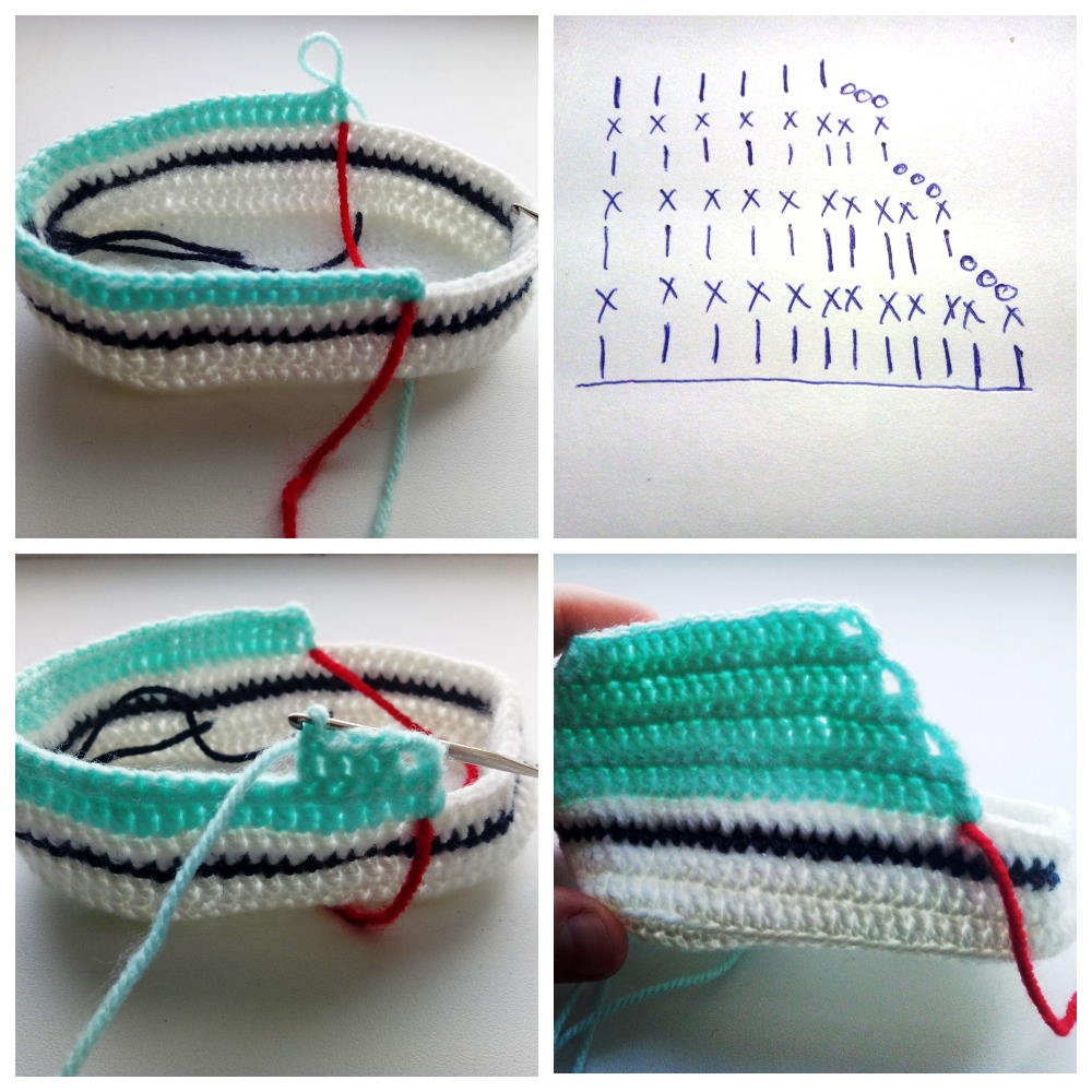 - Для вывязывания подметки применяют другой компонент узора – полустолбик. Кроме того, после 4 ряда бортика необходимо начинать убавление петель.
