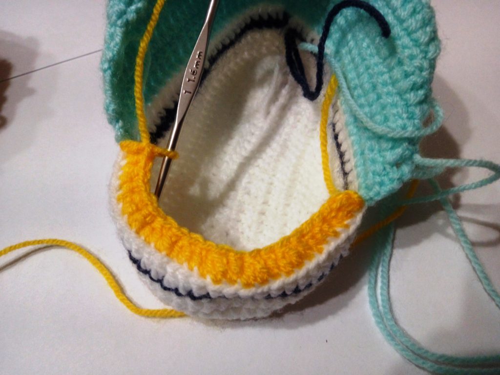 По краю носка кедика набираю 17 с.с.н., в обратную сторону ряд с.б.н. Так же вяжу 9 рядов, чередуя ряд с.с.н и ряд с.б.н. Отрезаю нить, закрепляю и прячу хвостик. Шнурочки вяжу цепочкой в.п. Пинетки подойдут и девочкам, и мальчикам за счет универсальных цветов.