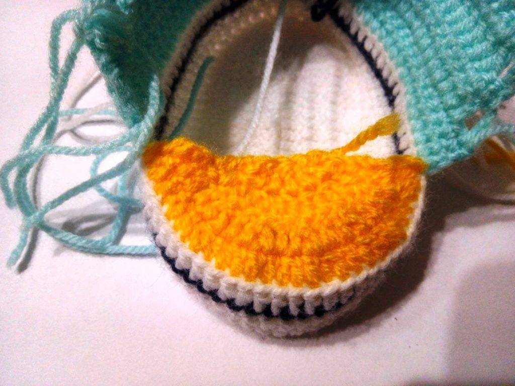 Возвращаемся к оставленным петлям под носочек пинетки-кроссовка. Для наглядности я взяла желтый цвет.
