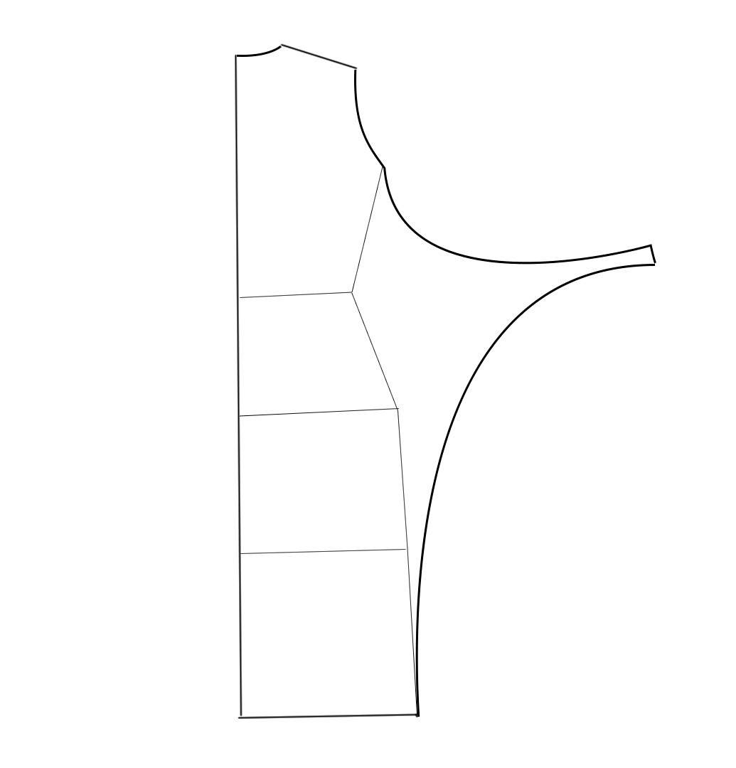 Углубите вырез горловины на 4 см и проведите новую линию горловины спинки. От линии бедер отложите вниз 15 см и проведите горизонтальную вспомогательную линию. От нижней точки проймы опустите вниз перпендикуляр до вспомогательной линии. Вправо отложите 15-20 см (это значение не постоянное и может меняться в зависимости от размера и ваших предпочтений).