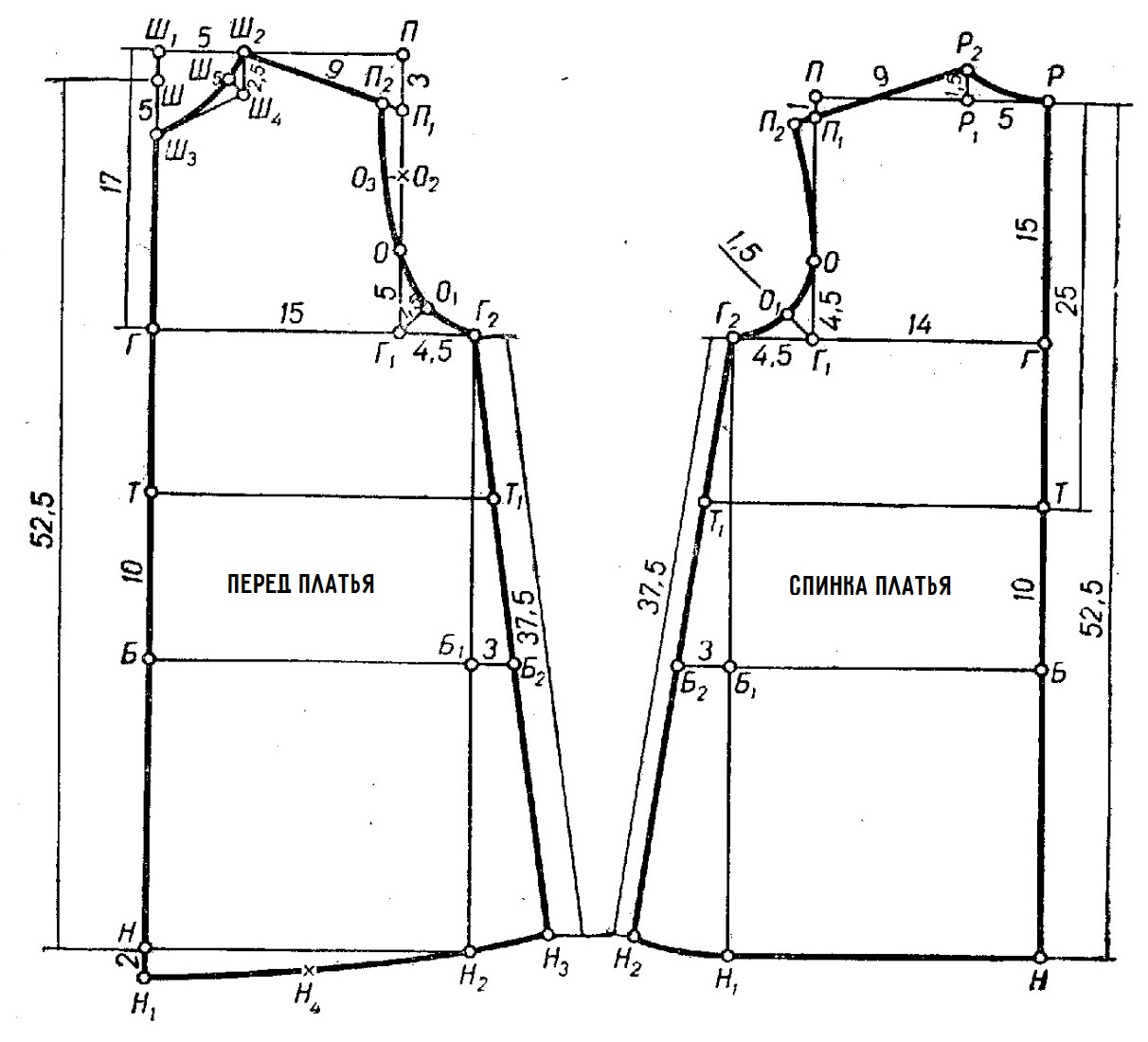 - Построение выкройки по представленному ниже образцу, но с корректировками с учетом собственных размеров (ГГ1 – линия бюста, ТТ1 – линия талии);