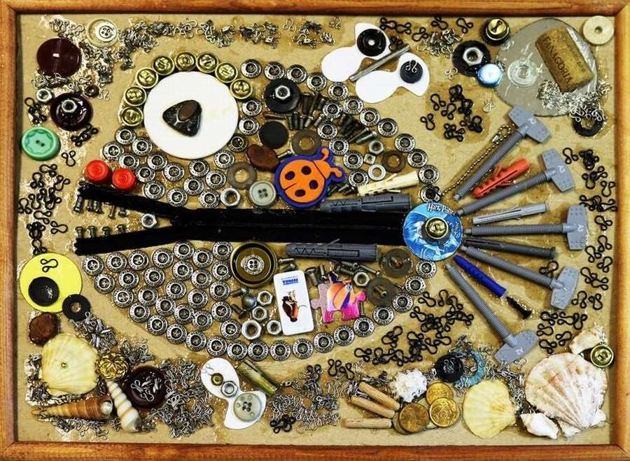 Еще одно произведение искусств из мусора. Но очень очаровательное. Сделана эта картина из чего только не придумаешь: детальки пазлов, пуговички, какие-то ненужные мелочи. Но итог – непредсказуем. Приятно непредсказуем.