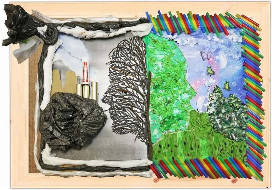 Картина из бросового материала на тему экологии – это отличный способ не только использовать ненужные полиэтиленовые пакеты, но и показать, во что может превратиться природа, если бросать мусор, где попало. Очень интересная и наглядная картина.
