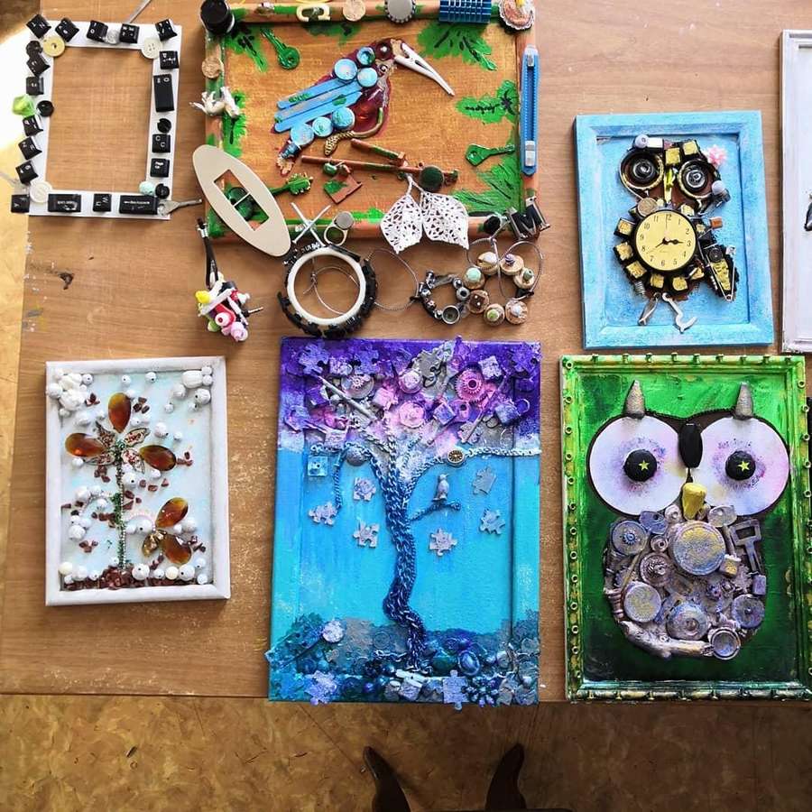 Небольшие картины из разнообразного мусора смотрятся очень оригинально: сова из часов и разных деталек, птица из палочек от мороженого, пуговичек и всякой всячины, дерево из старой цепочки и прочих металлических и, не только, вещей.