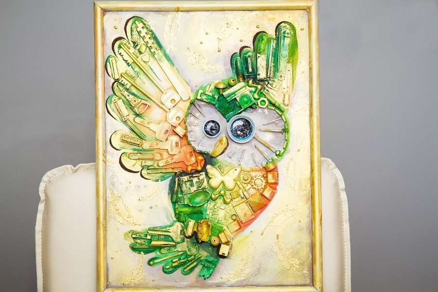 Необычная картина – сова, выполнена всего лишь из ненужного хлама и немного тонирована разными цветами.
