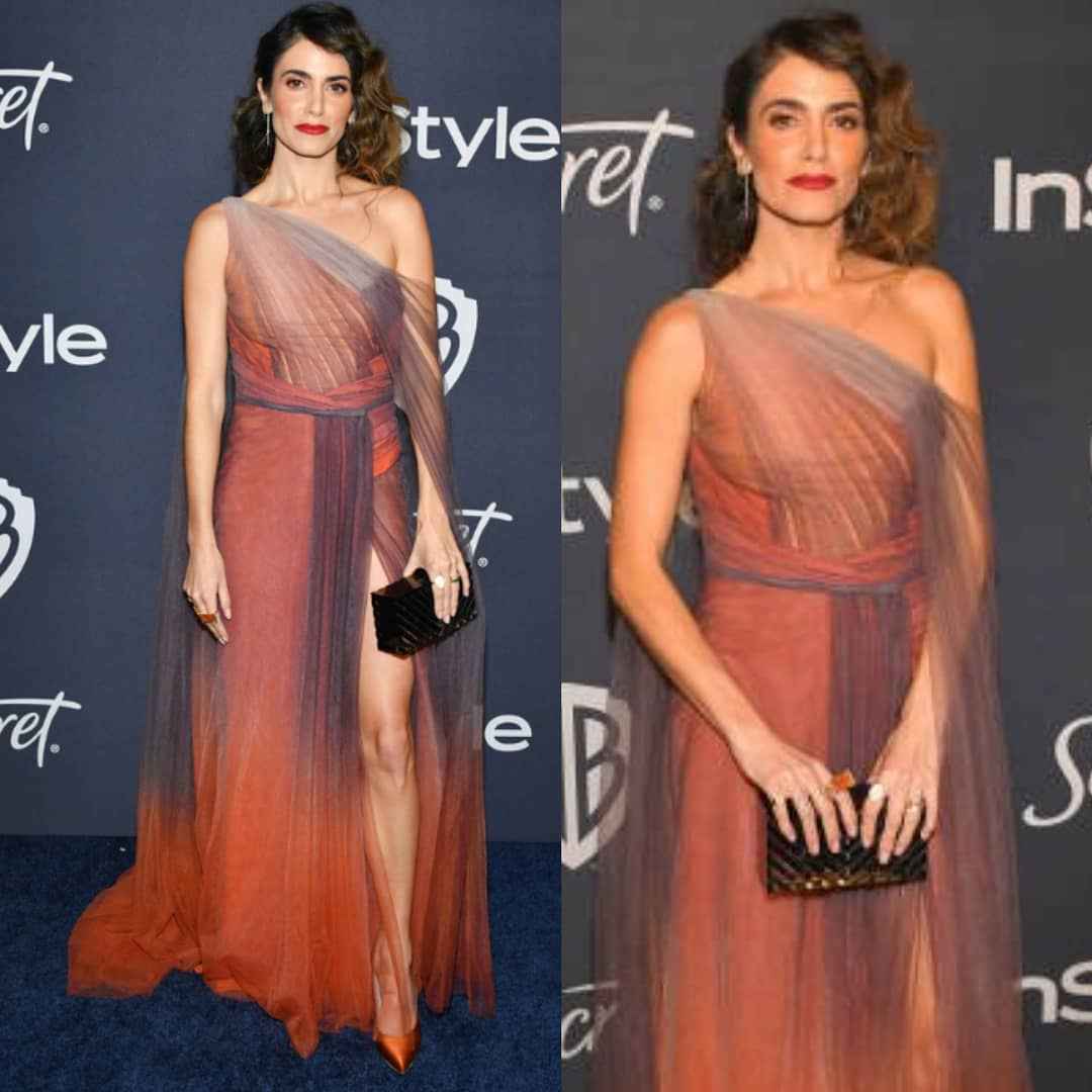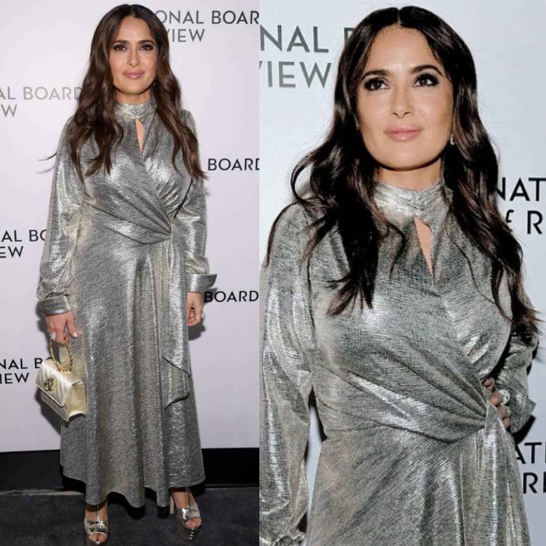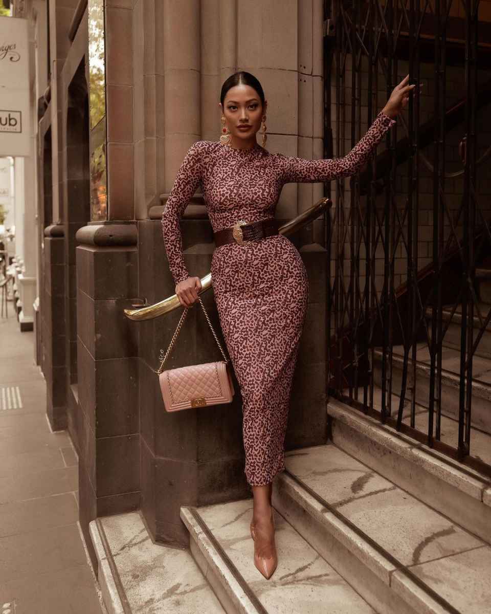 Планируется торжественный банкет? Тогда можно подобрать длинное платье с прямой юбкой, как у на следующем фото. Оно должно быть достаточно закрытым, может иметь принт или быть сшитым из фактурных тканей, перечисленных выше.