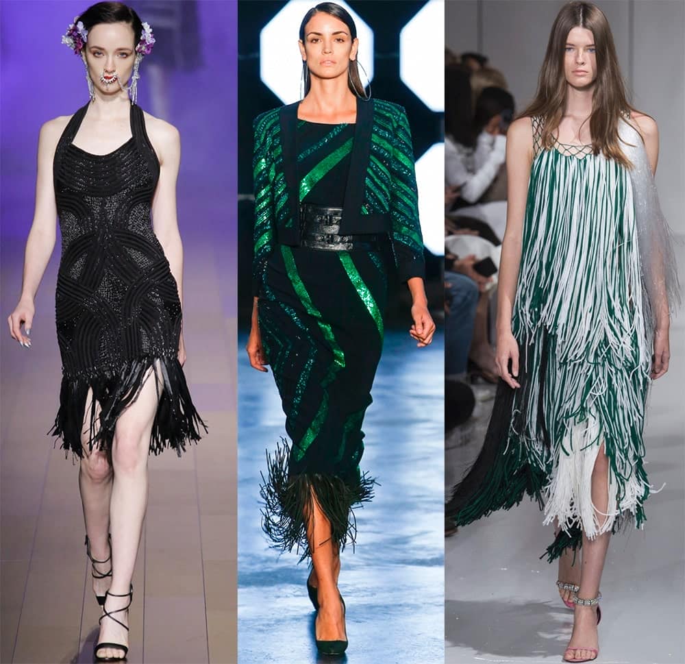 Эти платья украшались бахромой и паетками (паетки – крупные плоские блестящие украшения, напоминающие стразы). Рукава им заменяли длинные перчатки, а на голове у девушек Чикаго были повязки с перьями и бисером. Если Вам нравится стиль Чикаго, надевайте короткие платья, балетки отделанные стразами и перчатки. Обязательно носите повязку или шляпку. А если вам больше нравятся брючные комплекты, то добавьте к ним сумочку кошелек и штиблеты.