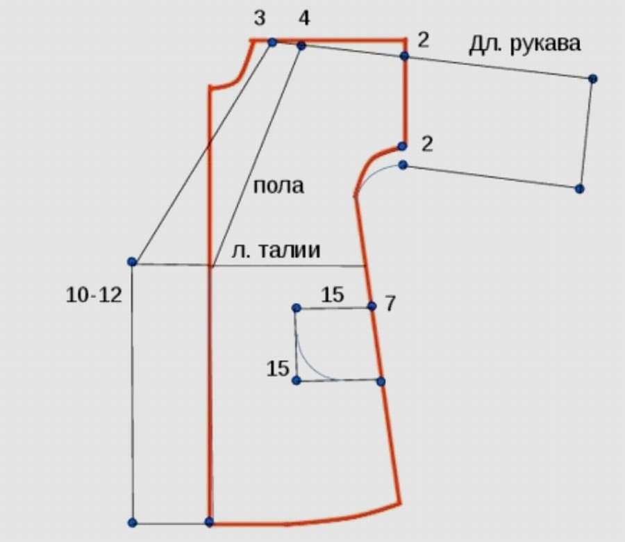 Схема построения выкройки халата кимоно. На фото – одна полочка для примера, принцип построения остается тем же.