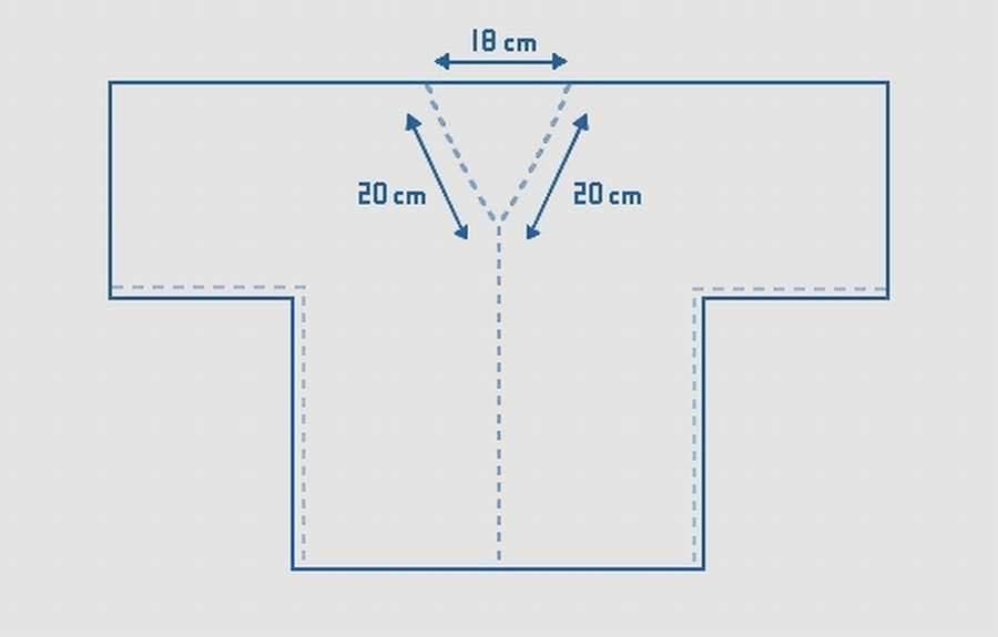 - Тот угол сложенной ткани, который не имеет открытых краев – место будущей горловины. От него нужно отмерить 3 см вниз и 9-11 см по сгибу, соединить точки округлой линией, прорисовав мелом или обмылком.