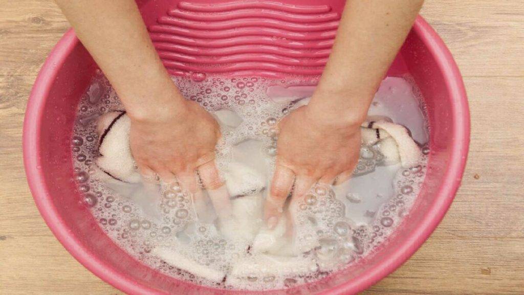 - Замочить вещи ненадолго в растворе подогретой воды, порошка и буры.