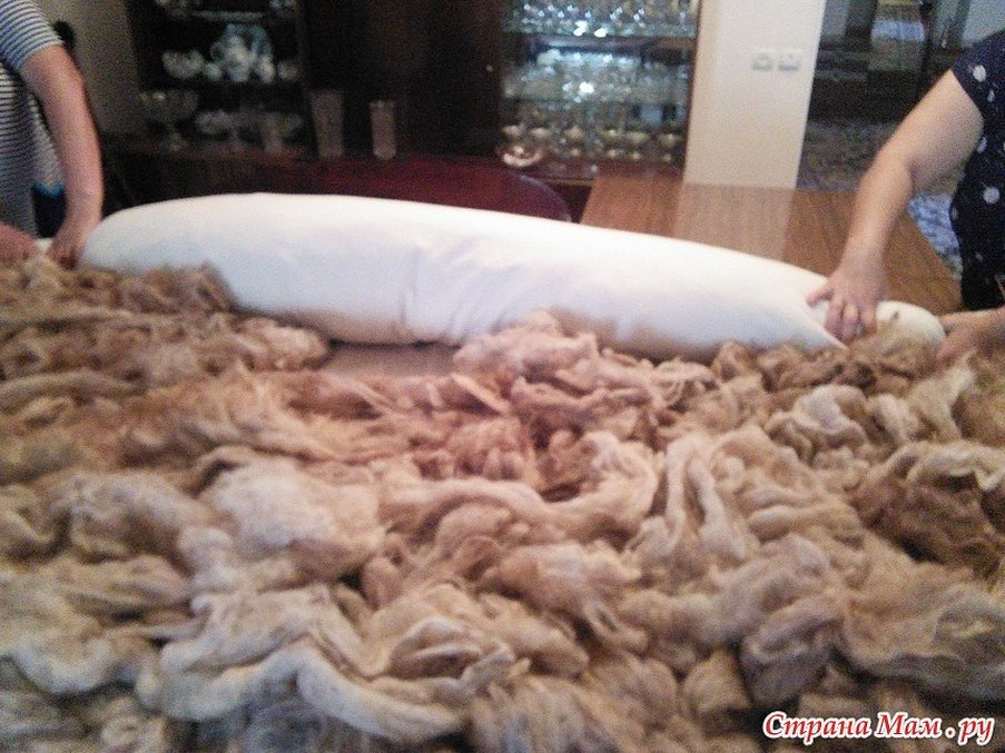 - Укладывание шерсти. На хорошо распрямленное одеяло нужно выложить шерстяные волокна. Их необходимо разровнять ладонями и позвать помощника, который станет с другой стороны и скатает одеяло в рулон. Сворачивать нужно не очень плотно и постоянно заталкивать пряжу, которая свисает по краям. Необходимо вместе взяться за незашитый край и натянуть на рулон. Затем расправить бока и вывернуть чехол в обратную сторону. Шерсть должна оказаться внутри, после чего её хорошо разглаживают руками. Расшитый край чехла аккуратно зашивают.
