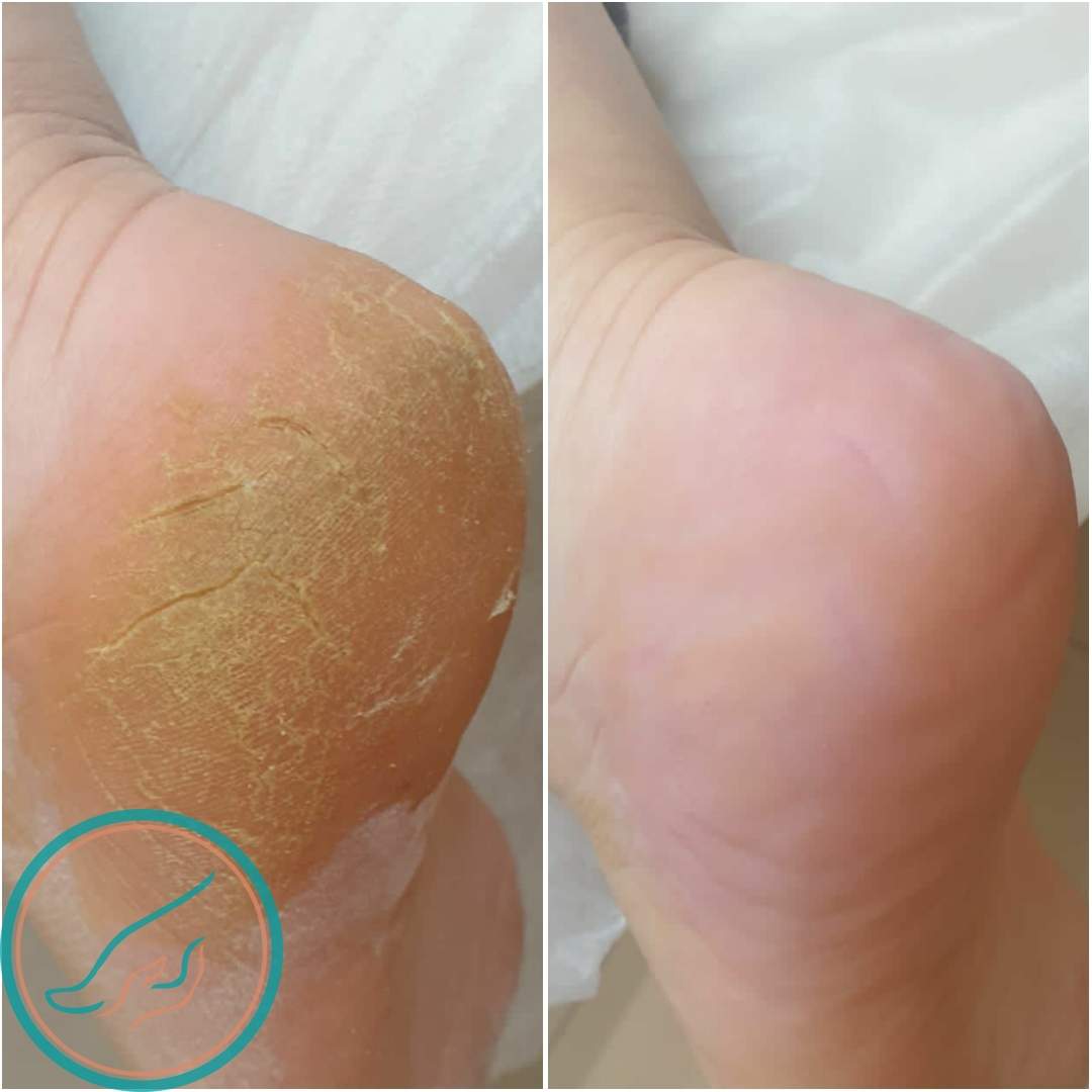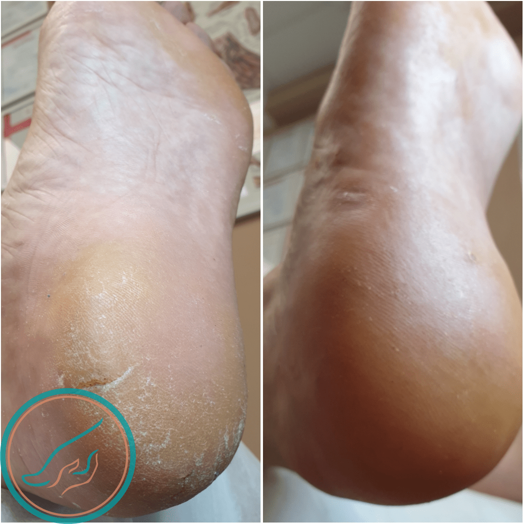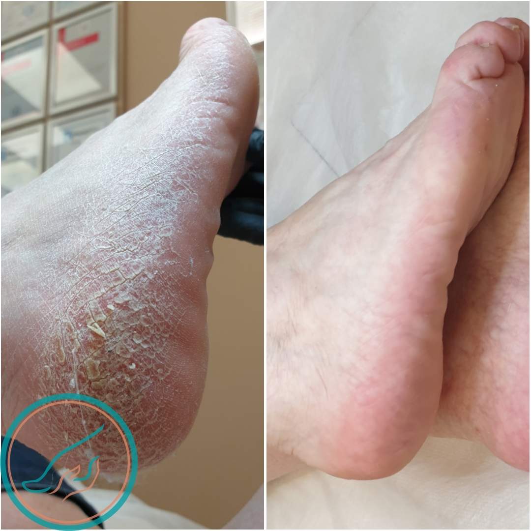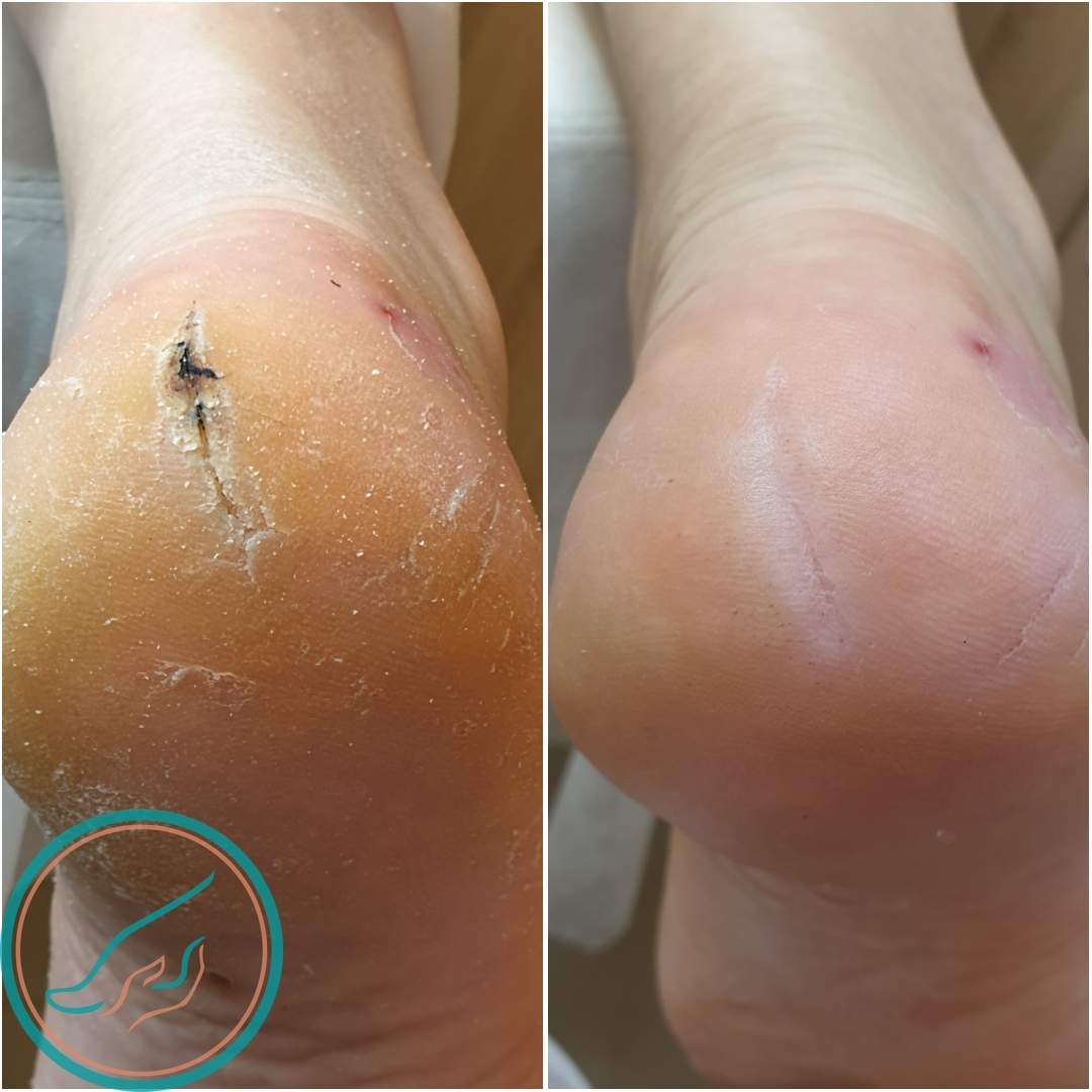 Трещины на пятках, до и после обработки в Цетнтре подологии