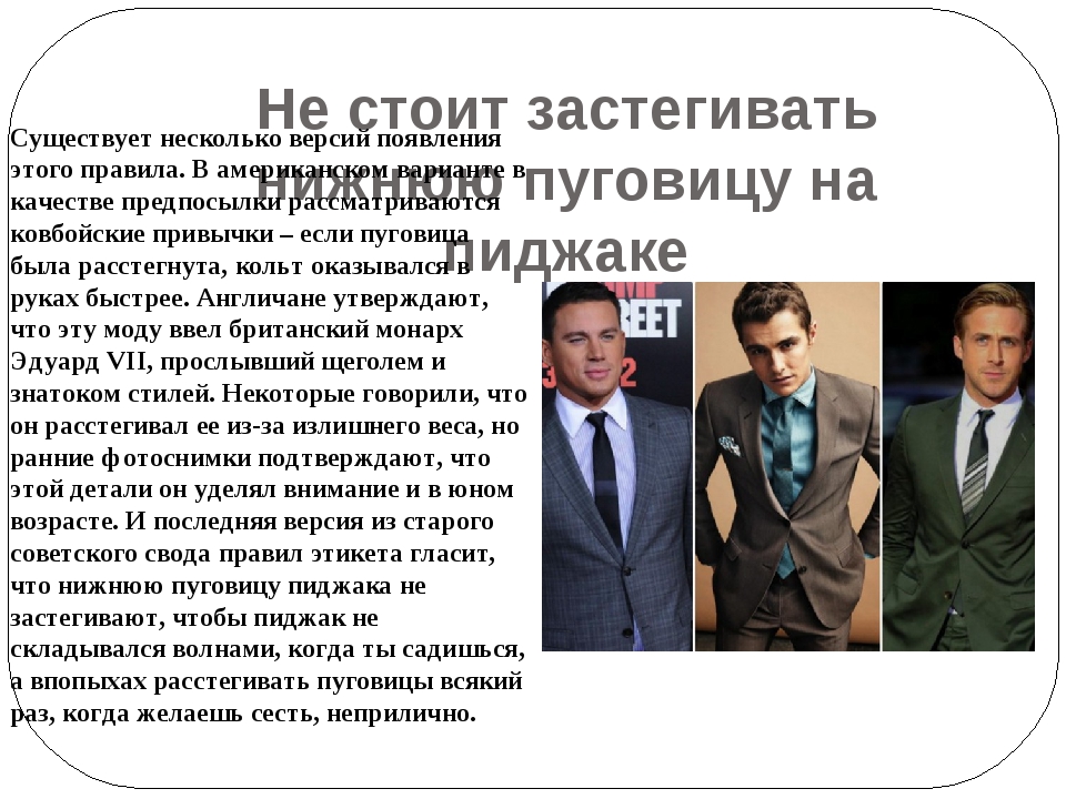 - Чтобы подчеркнуть, что человек знает этикет. Мужчина, который разбирается, какая пуговица на пиджаке застегивается, а какая расстегивается, априори считается образованным, хорошо воспитанным и культурным. Другими словами, «пуговичная тема» помогает формировать правильный имидж и благородную репутацию.