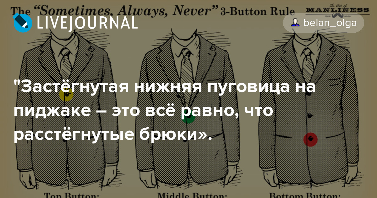 Как застегивать такой пиджак? Как и в первом случае, нижнюю — не застегиваем. Среднюю — застегиваем всегда. Верхнюю — в зависимости от ситуации: в формальной — застегиваем, в более повседневной можно оставить незастегнутой (как на фото).