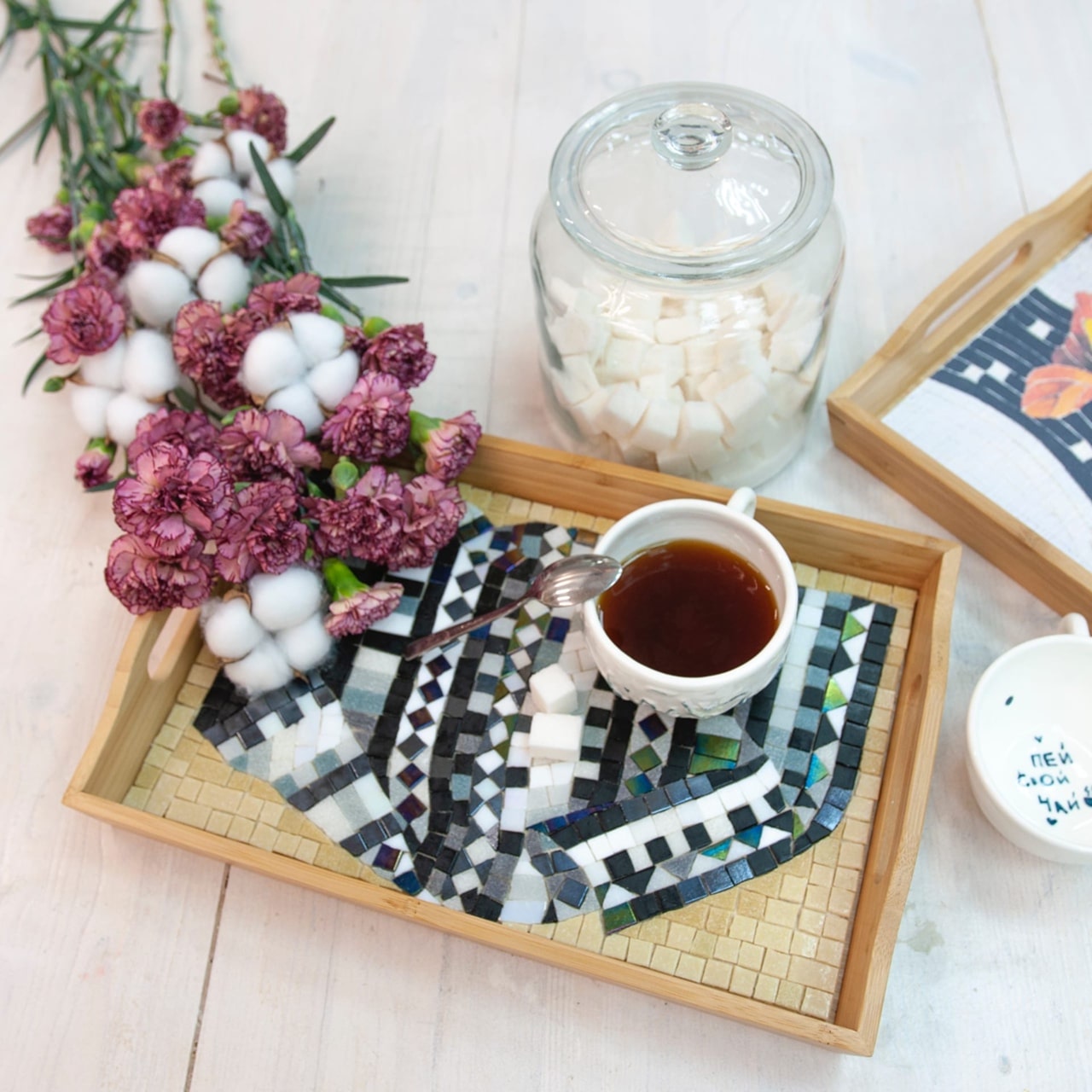 Мозаика обладает магическим свойством преображать любой предмет обихода. Курс «Поднос» рекомендован всем людям, которые чувствуют в себе большой творческий потенциал и стремятся его реализовать, кому интересна мозаика и есть желание создать предмет интерьера своими силами. Ученики курса получают возможность самостоятельно декорировать поднос. Они выбирают макет и эскиз – это могут быть этнические рисунки, растительный орнамент или изображения животных, сюжеты из области истории и мифологии. В результате обучения получается поднос, который станет отличным дополнениям к бытовым предметам.