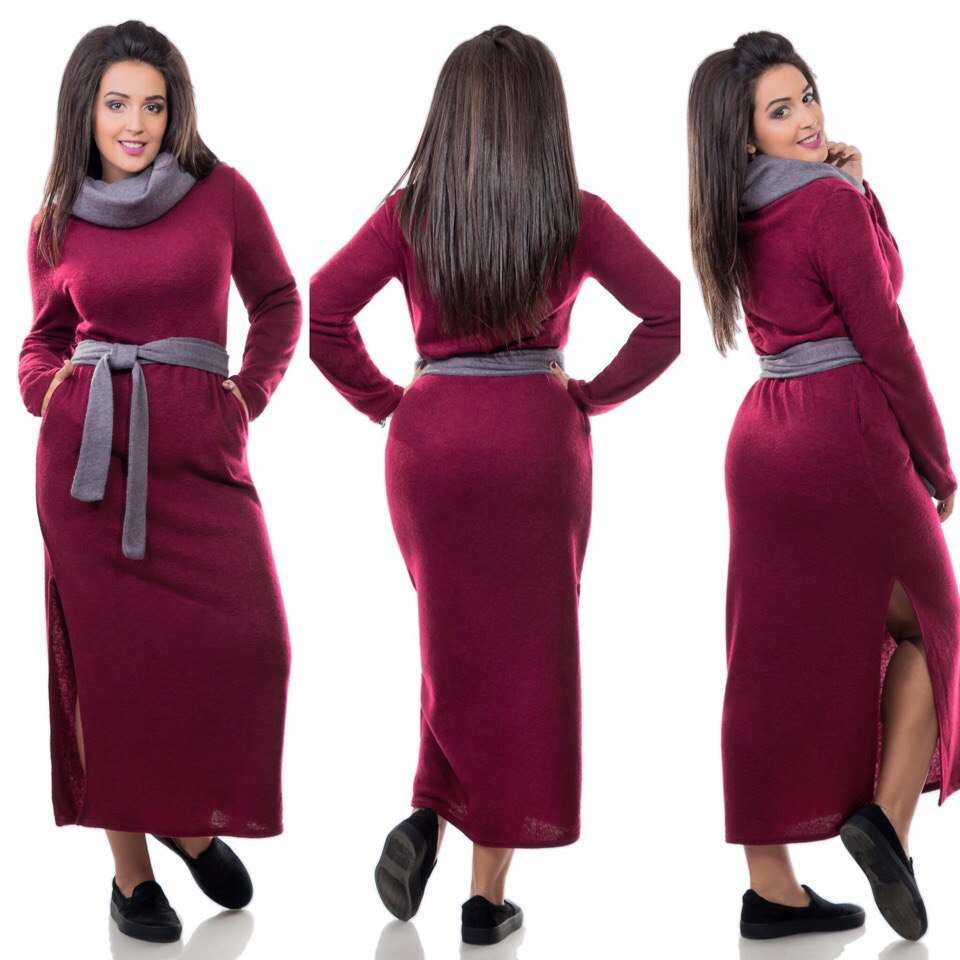 Нарядные, деловые и теплые вязаные платья с воротником хомут помогают отвлечь внимание от широких бедер и создать акцент на шее, зоне декольте и плечах. В зимнюю погоду они могут носиться без шарфа, а в весенню — без палантина, но необычный образ гарантирован в любом случае