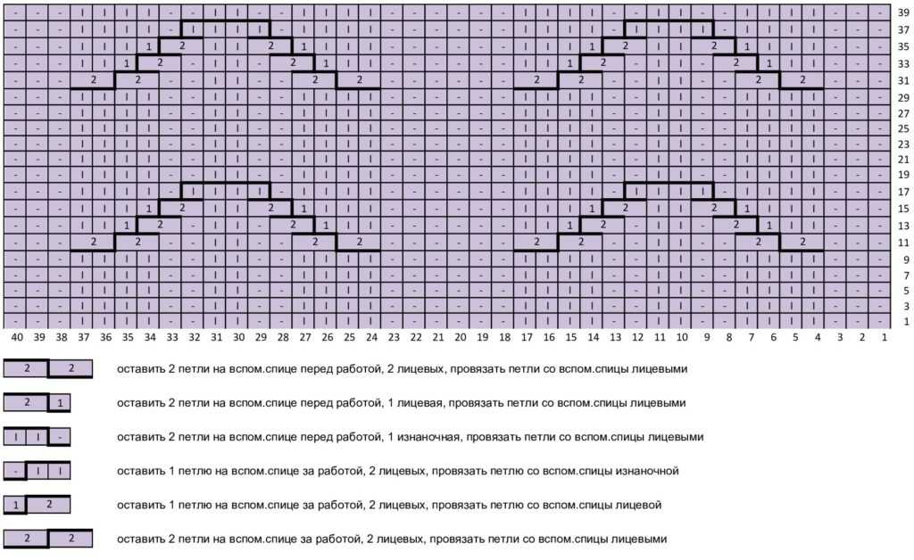 - В 3-ем делают две изнаночные, снимают на дополнительную спицу две петли. Разместив их впереди полотна, вывязывают две лиц-ые, затем возвращают на основную, делают их лиц-ми. Последние две петельки рапорта изнаночные.