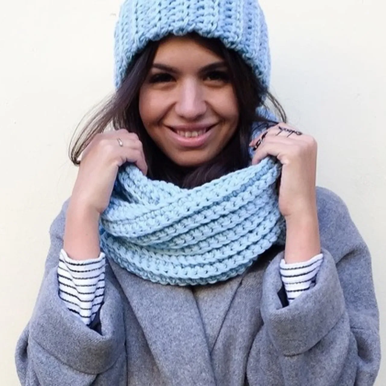 - Пряжа 1 (100% экстратонкой овечьей шерсти; ок. 105 м/50 г) – 400 (450) 500 г голубой;