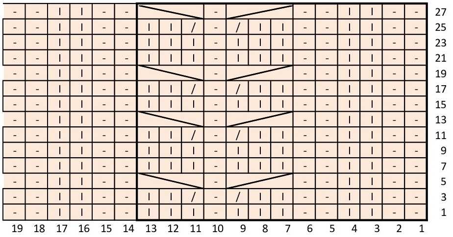 Провязать один раз с 1-го по 5-ый ряд, затем повторять со 2-го по 5-ый ряд необходимое количество раз.