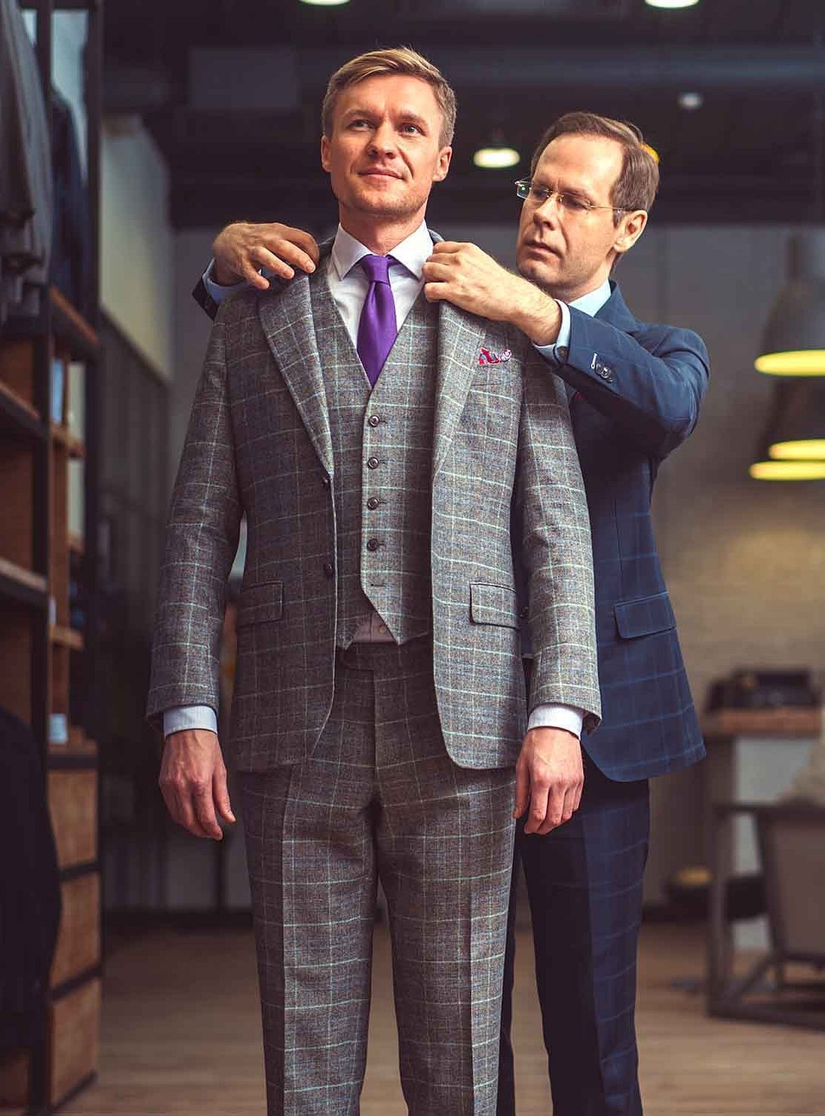 - Определение проекта. После этого определяется фасон, подходящий для определенного человека, создается выкройка и выполняется пошив костюма. Если человека все устраивает, то временные швы заменяются на обычные.