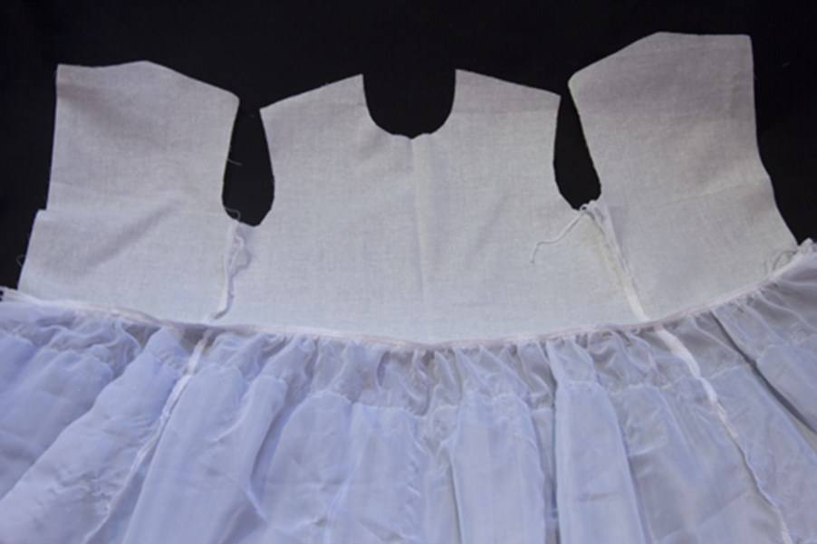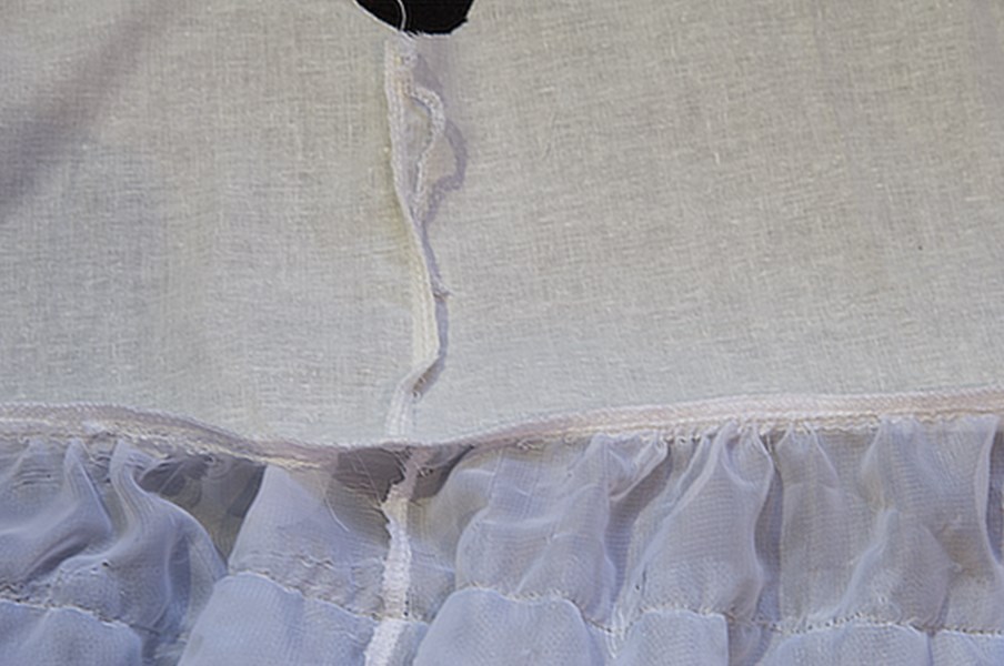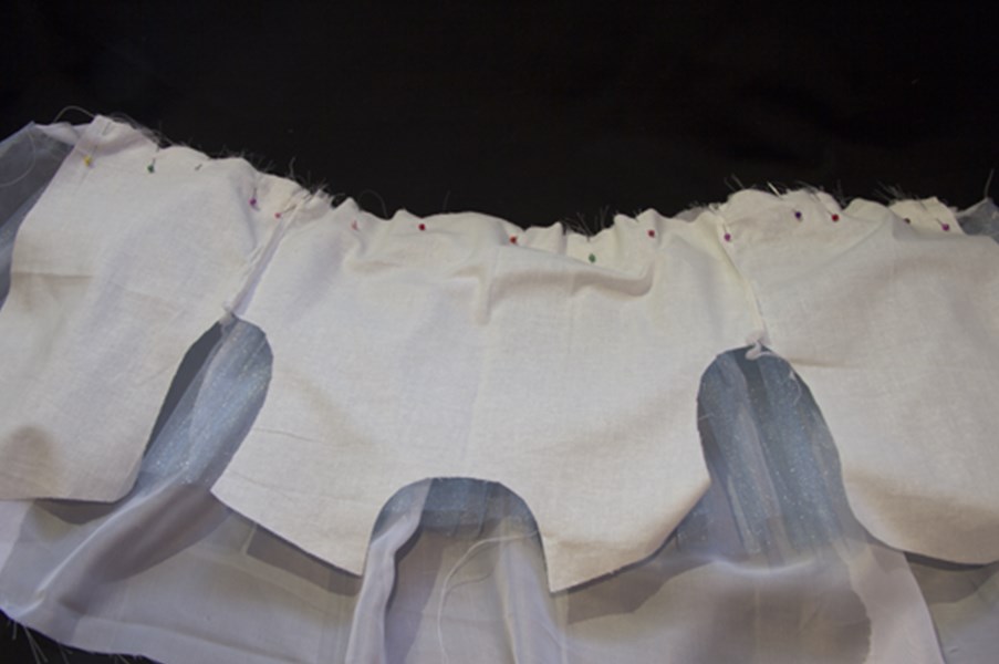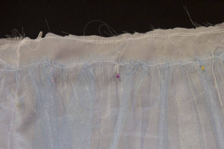 Равномерно распределяем складочки на фатине и притачиваем его к изнаночной стороне юбочки подкладки, от верхнего среза отступаем на 3-3,5 сантиметра.