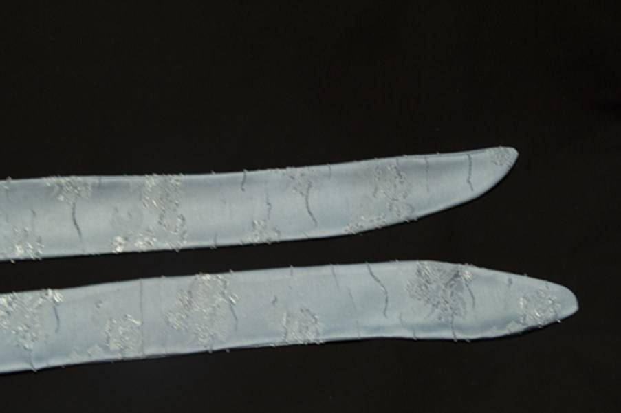 С помощью ножниц обрезаем уголки, отступая 3-4 мм от шва – это мы делаем для аккуратного выворачивания изделия и избегания топорщащихся углов. Далее выворачиваем поясок на лицевую сторону с помощью карандаша или английской булавки. Аккуратно выглаживаем уголки, придавая им аккуратную форму. Выравниваем поясок, намётываем его по краю и проглаживаем утюгом, снимаем намётку. Подворачиваем края пояска вовнутрь, проглаживаем его и прошиваем.