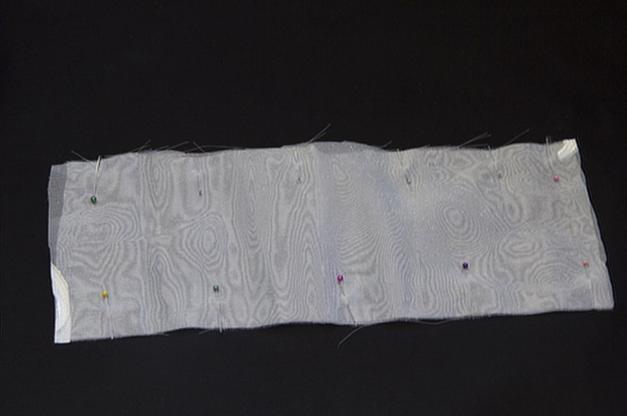 Осталось только сшить пояс! Для этого выкраиваем прямоугольную заготовку 250 х 11 см – эта длина позволит нам варьировать узел и даже завязать поясок в бант практически на любой фигуре. Если же у нас нет такого длинного отрезка ткани, сшиваем поясок из нескольких кусочков, обязательно раскладывая швы в обе стороны и тщательно отпаривая их горячим утюгом. Складываем заготовку для пояса вдоль пополам лицом внутрь, намётываем булавочками одну короткую и одну длинную стороны. Сшиваем пояс обычной строчкой, оставляя одну короткую часть не прошитой.