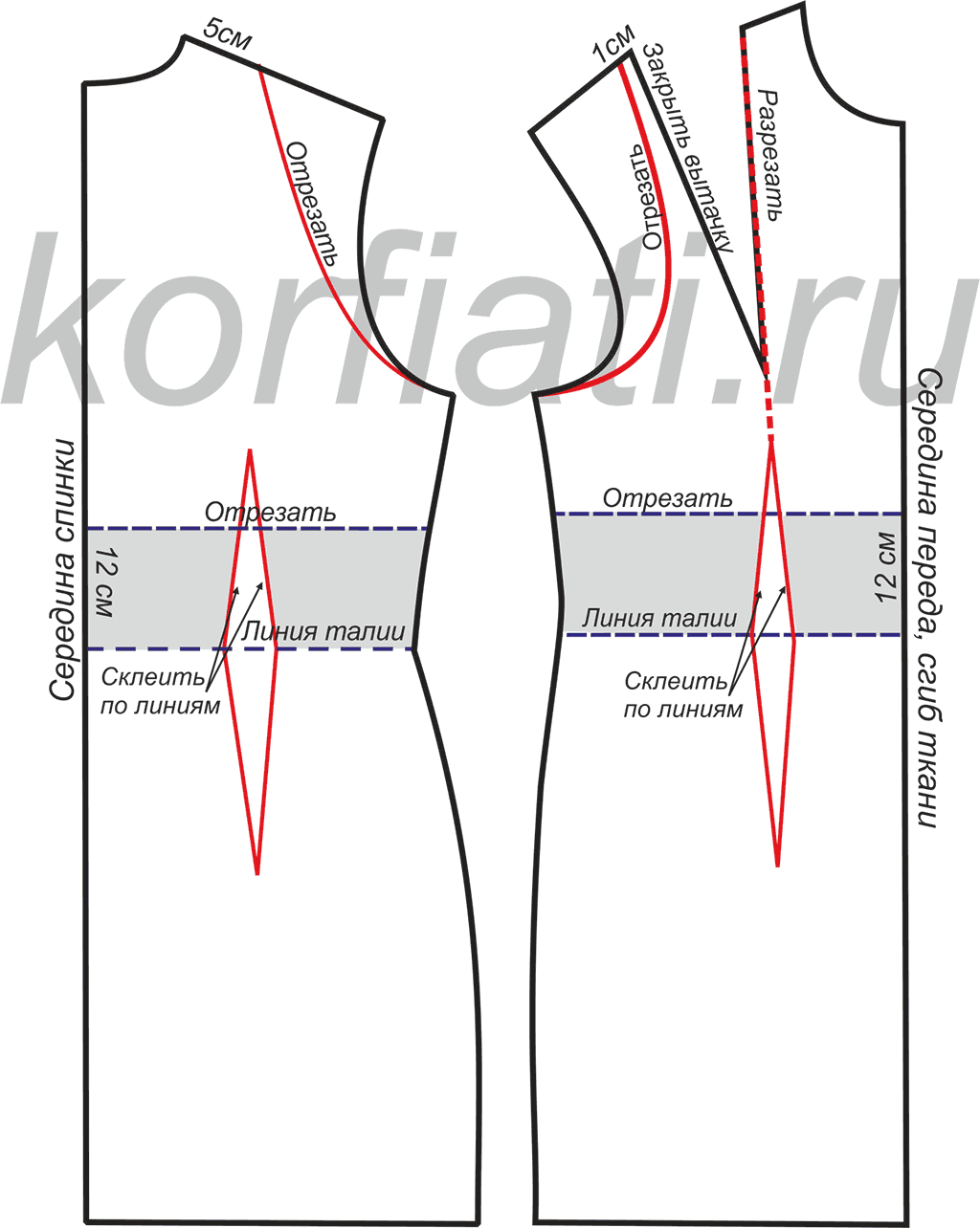На выкройке переда платья от левой стороны нагрудной вытачки отложите 1 см влево и проведите новую линию проймы. Закройте нагрудную вытачку, разрезав по пунктирной линии красного цвета.